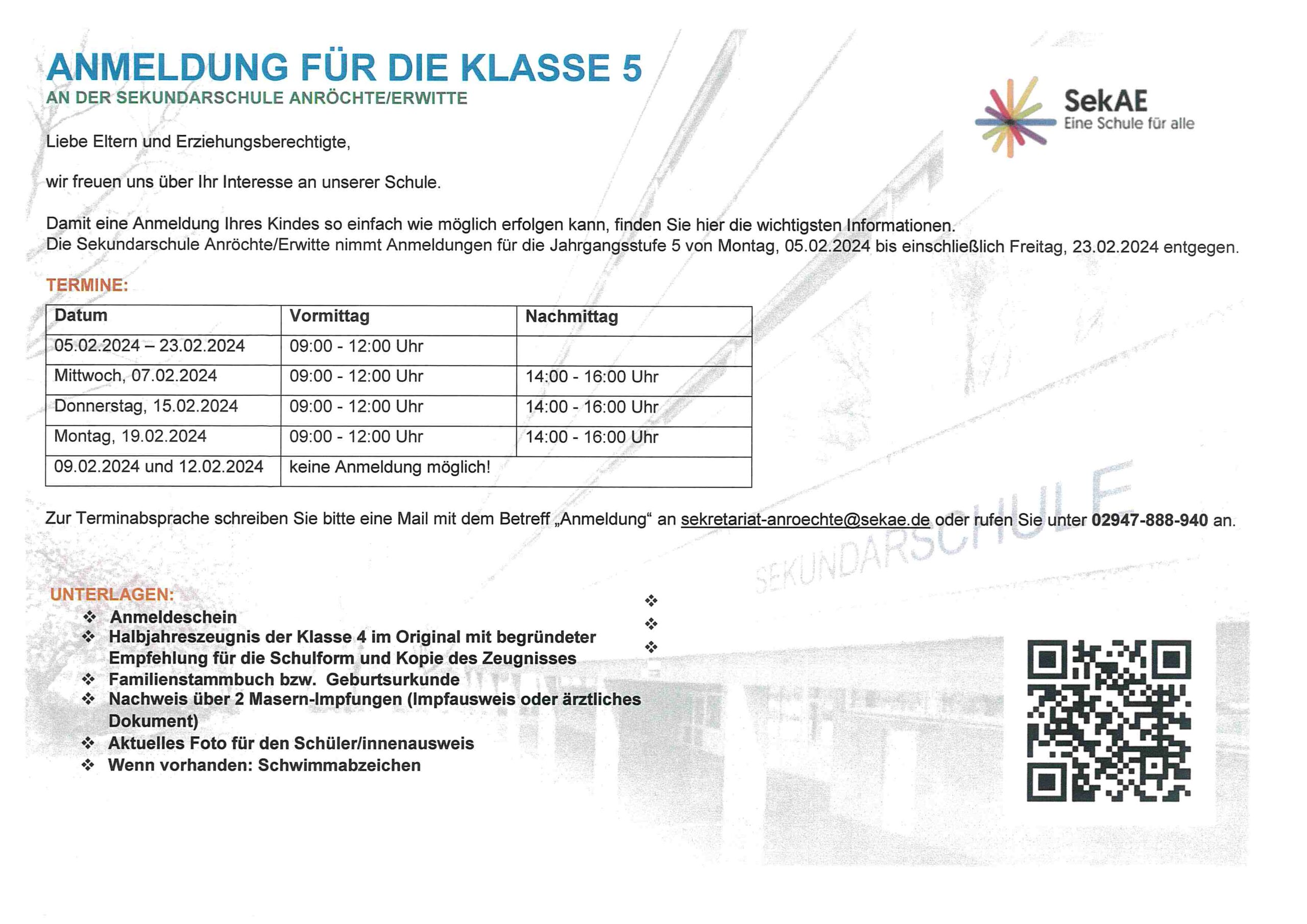 ANMELDUNG FÜR DIE KLASSE 5 AN DER SEKUNDARSCHULE ANRÖCHTE/ERWITTE