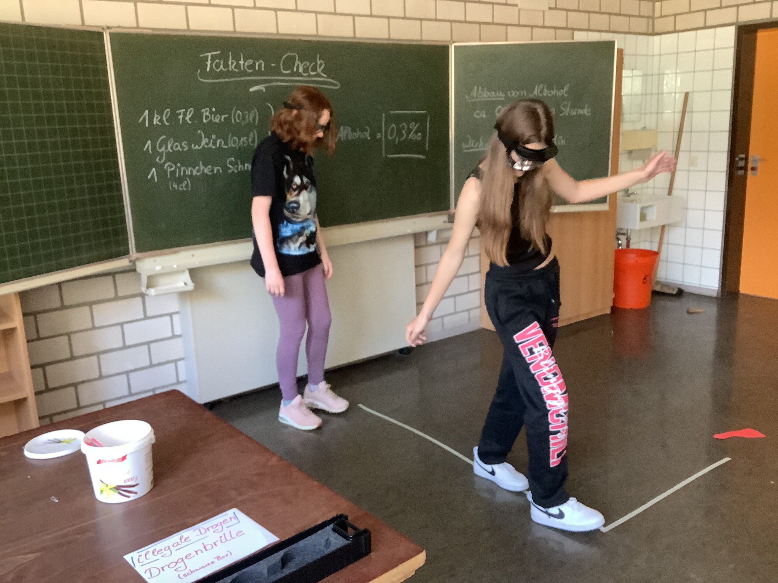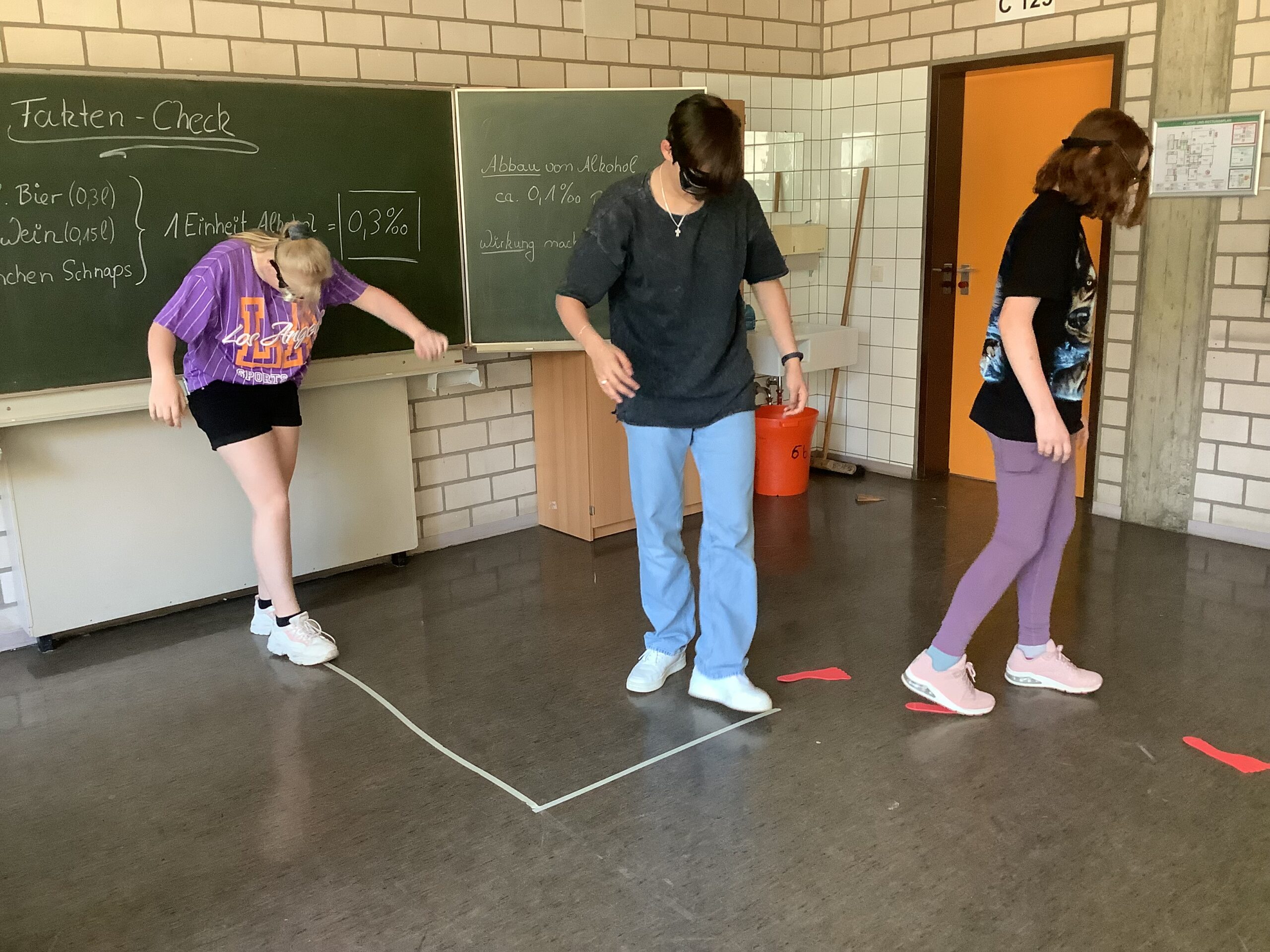 Zum Abschluss durften die Schüler*innen die Rauschbrillen, die unterschiedliche Promillewerte (0,3 –1,5 Promille) simulieren, in einem kleinen Parcour ausprobieren. So konnten sie am eigenen Leib erleben, dass einfache Dinge, wie z.B. einen Ball aufzuheben, gerade auf einer Linie zu gehen oder sich die Hand zu geben unter Alkoholeinfluss sehr erschwert oder gar nicht mehr möglich sind.